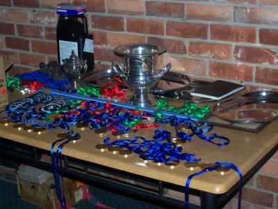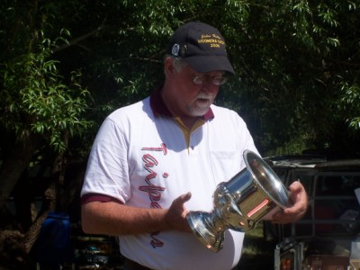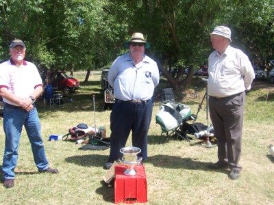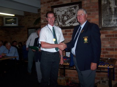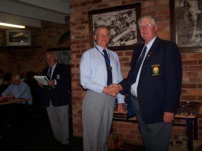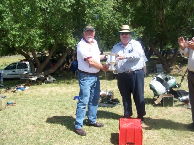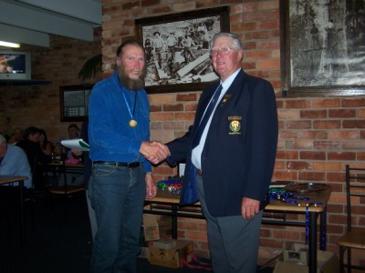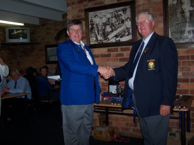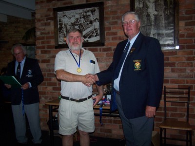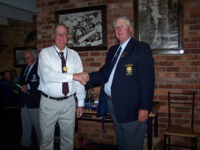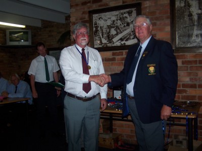 Jim Freebairn presents Tom Holinger with medals, badges and prizes for F-class